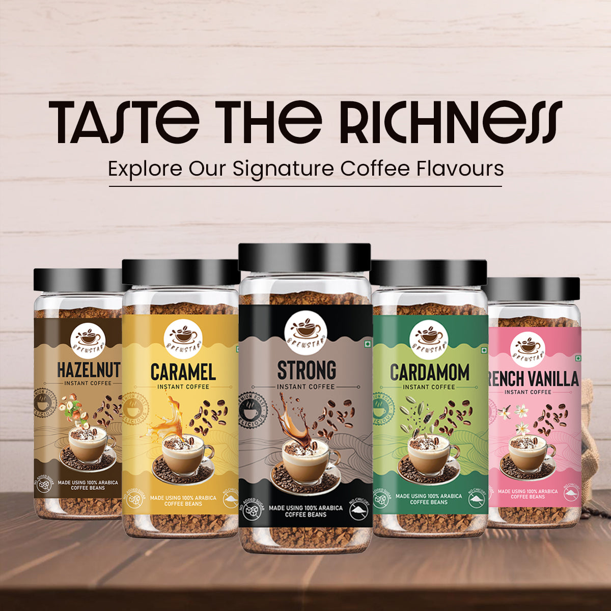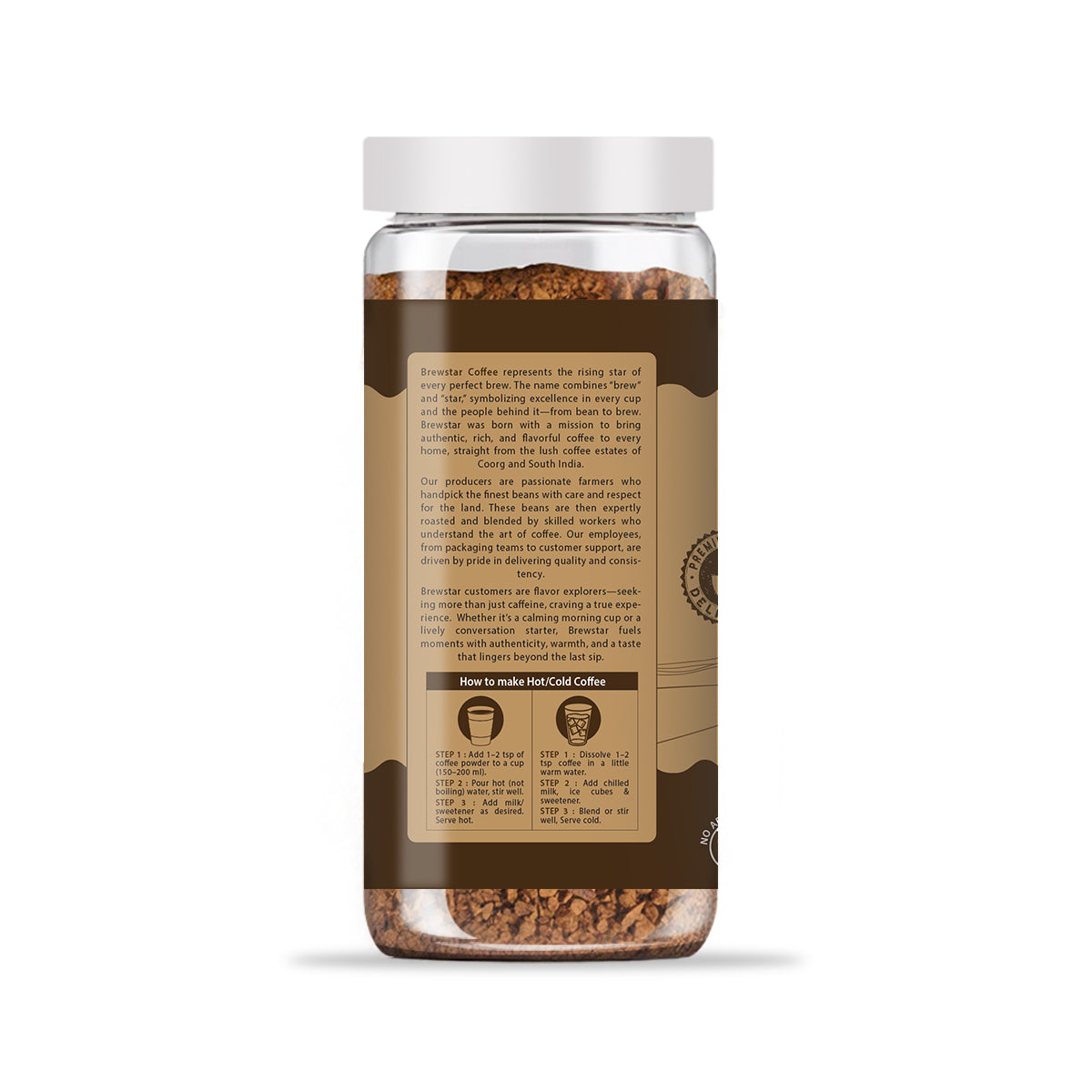 Brewstar believes in delivering the best range of coffee. Brewstar Crunchy Hazelnut coffee is a precise blend of Arabica and Robusta beans that creates the most delicious coffee flavour. (The finest coffee beans are sourced from our optimal Coorg coffee farms).