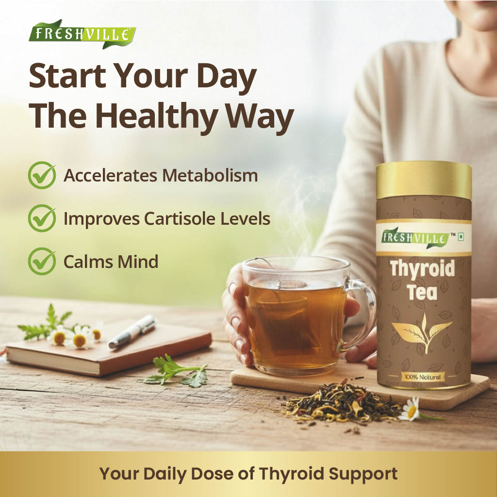 Freshville Thyroid Tea is a herbal tea blend designed to support thyroid health. It is marketed as a natural supplement to help manage thyroid function and the symptoms associated with an underactive or overactive thyroid. The blend combines a variety of herbs, spices, and seeds that are traditionally used in Ayurveda and other herbal medicine systems for their potential effects on hormonal balance and inflammation.