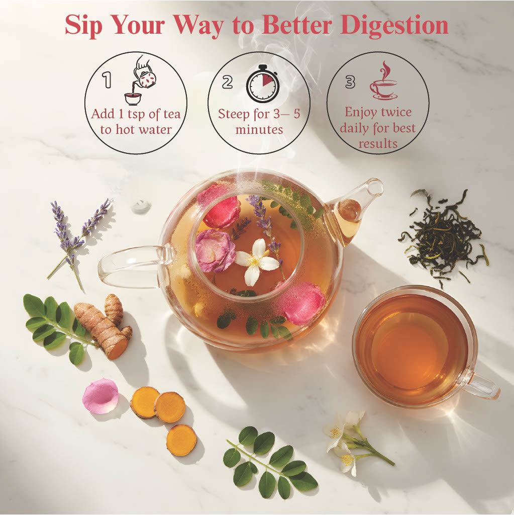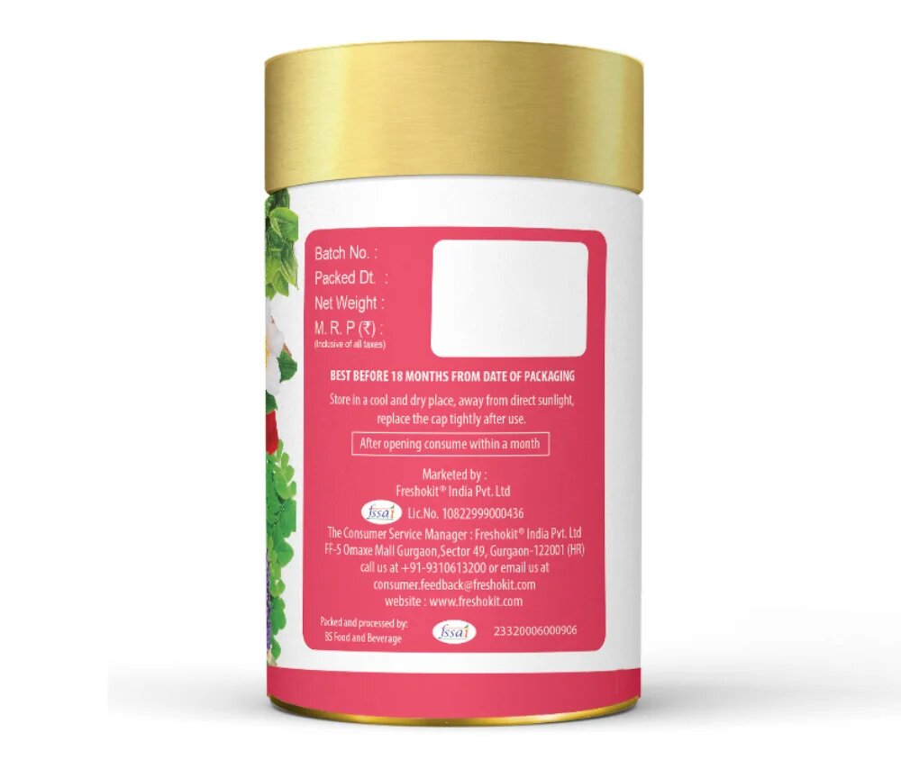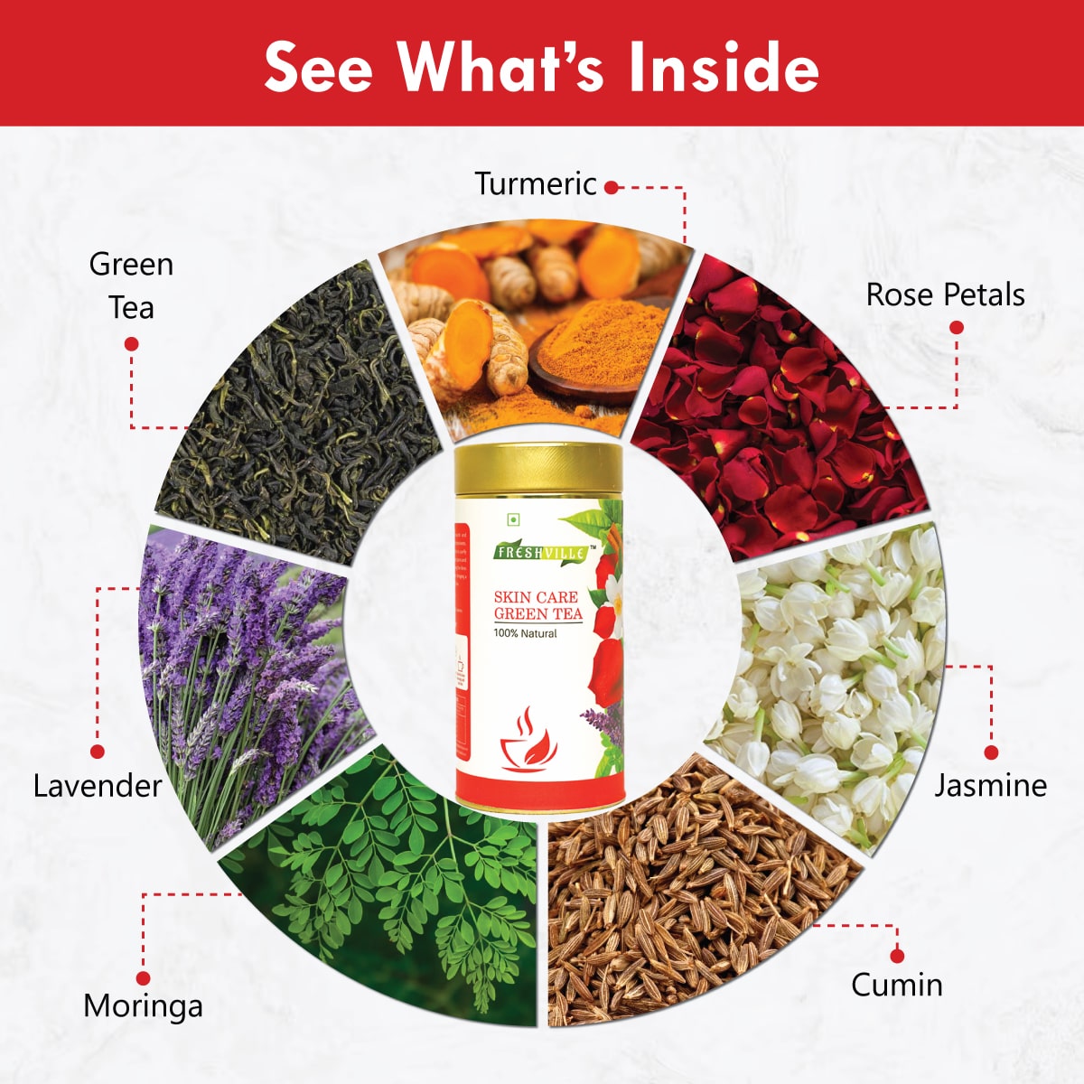 | Key Ingredients | Turmeric, Cumin, Lavender, Rose Petals, Jasmine, Moringa, Green Tea |