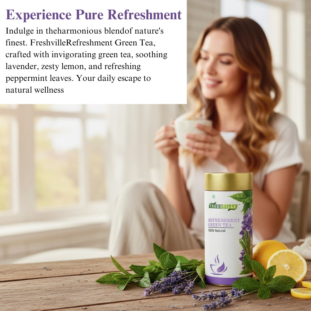 Freshville Refreshment Green Tea is a specific brand of herbal green tea blend. It combines the health benefits of green tea with a mix of soothing and aromatic herbs like peppermint, lemon, lemongrass, and lavender. The blend is designed to be a refreshing and calming beverage that can be enjoyed at any time of day to promote a sense of well-being.